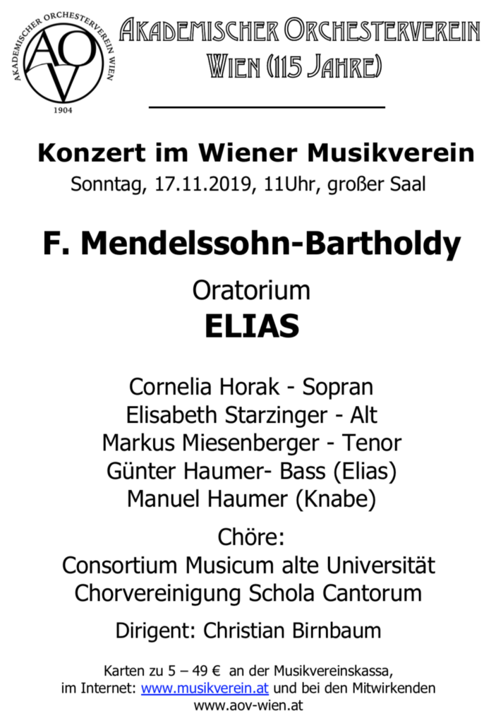 Gemeinsam mit großartigen Gesangssolisten und den Chören Consortium Musicum Alte Universität und der Chorvereinigung Scola Cantorum führen wir in unserem großen Herbstkonzert das Oratorium ELIAS von Mendelssohn-Bartholdy auf und hoffen Euch dabei begrüßen zu dürfen! Hier ist der Link zum Online Kartenverkauf des Musikvereins: (bitte anklicken)