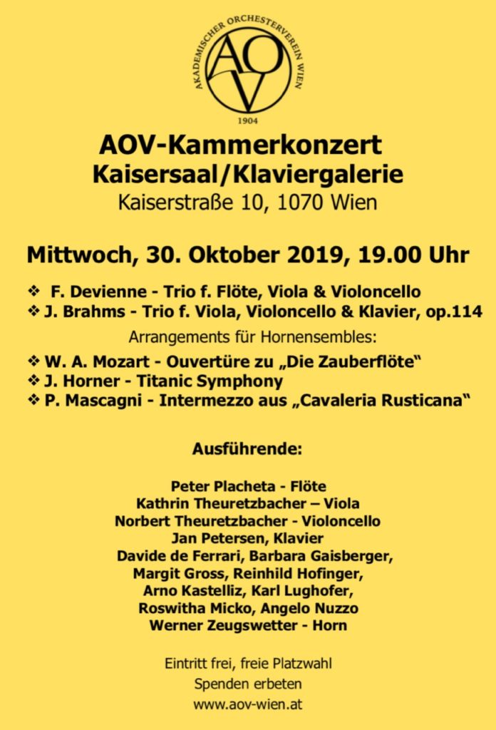 Es ist wieder soweit – am Mittwoch, dem 30. Oktober 2019, 19:00 Uhr spielen wir ein Kammerkonzert mit Mitwirkenden aus unserem Orchester und Freunden. Kammermusik ist eine traditionsreiche Sparte im AOV, sehr wichtig für den Ausgleich zum Orchesterspiel und wir bemühen uns, mindestens ein Konzert pro Jahr zu veranstalten. Auch heuer haben sich wieder etliche Ensembles gefunden und wir freuen uns über das erstmalige Auftreten unserer Horngruppe mit einigen Spezialarrangements ganz besonders.
